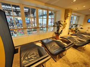 Pas de bibliothèque, mais un coin massage où les femmes et hommes d'affaires peuvent venir se détendre avec la vue sur le Hall 1 et ses interminables va-et-vient.