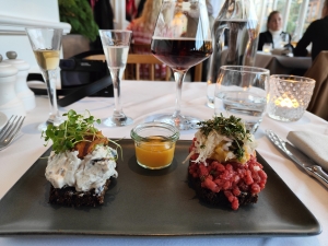 notamment savourer les fameux smà¸rrebrà¸d, tartines au pain de seigle au beurre agrémentées de saumon fumé, de hareng mariné et aux oignons, au tartare de bœuf, aux filets de carrelets panés. Chacun des mets est servi avec un traditionnel Snaps fait maison par Per Grane, chaleureux serveur qui confectionne lui-même ces eaux-de-vie qu'il a déclinées en version de Noël avec des notes de vanille, anis, cannelle, miel et onze autres ingrédients secrets. De surcroît, il en a élaboré une spécialement pour accompagner le dessert emblématique danois : le riz à l'amande, un riz au lait avec des copeaux d'amandes accompagné d'un coulis de cerises.
