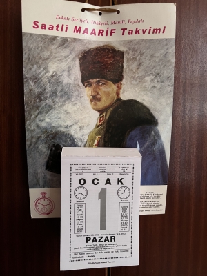 Récemment, en passant par Bab-ı Ali, je me suis arrêté chez Madame Aydın Geylani, l'une des propriétaires du Saatli Maarif Takvim. Je dois préciser que nous ne nous connaissions pas encore. Nous avons conversé debout pendant une demi-heure. Puis j'ai choisi un calendrier à l'effigie d'Atatürk. J'avais déjà attiré l'attention de cette dame avec ce choix...