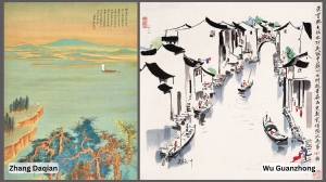 Considéré comme le fondateur de la peinture chinoise moderne, Wu Guanzhong a mélangé les techniques traditionnelles chinoises et les influences occidentales pour créer un style unique. Né en 1919, il a étudié en Chine, puis à Paris où il a été marqué par le modernisme européen. Ses œuvres représentent souvent des paysages chinois, mais avec des couleurs vives, des formes abstraites et des coups de pinceau dynamiques. Il voulait créer un lien entre les cultures en associant la peinture chinoise et la liberté expressive de l’abstraction occidentale.
